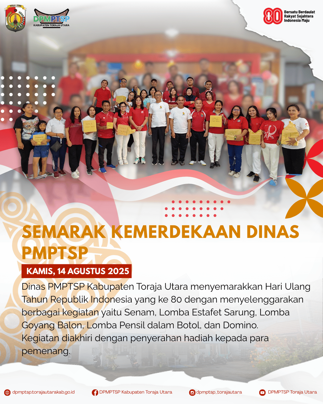 Dinas PMPTSP Kabupaten Toraja Utara menyemarakkan Hari Ulang Tahun Republik Indonesia yang ke 80 dengan menyelenggarakan berbagai kegiatan yaitu Senam, Lomba Estafet Sarung, Lomba Goyang Balon, Lomba Pensil dalam Botol, dan Domino. Kegiatan diakhiri dengan penyerahan hadiah kepada para pemenang.