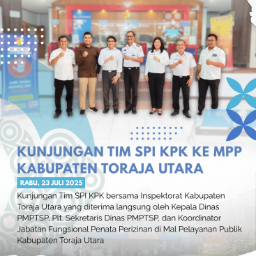 Kunjungan Tim SPI KPK bersama Inspektorat Kabupaten Toraja Utara yang diterima langsung oleh Kepala Dinas PMPTSP, Plt. Sekretaris Dinas PMPTSP, dan Koordinator Jabatan Fungsional Penata Perizinan di Mal Pelayanan Publik Kabupaten Toraja Utara.
