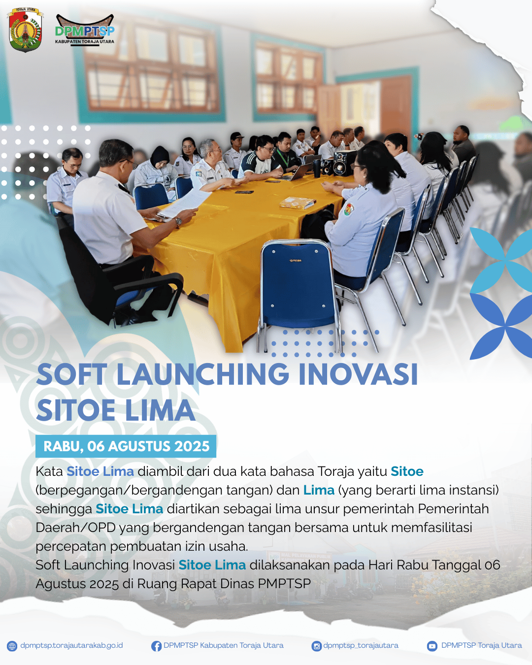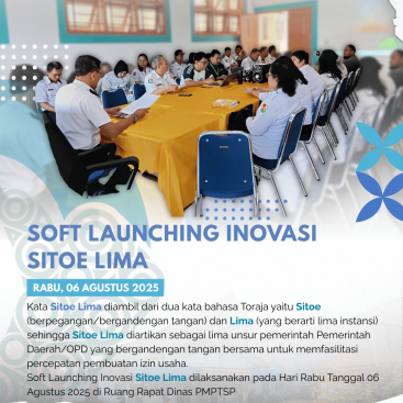 Kata Sitoe Lima diambil dari dua kata bahasa Toraja yaitu Sitoe (berpegangan/bergandengan tangan) dan Lima (yang berarti lima instansi) sehingga Sitoe Lima diartikan sebagai lima unsur pemerintah Pemerintah Daerah/OPD yang bergandengan tangan bersama untuk memfasilitasi percepatan pembuatan izin usaha. Soft Launching Inovasi Sitoe Lima dilaksanakan pada Hari Rabu Tanggal 06 Agustus 2025 di Ruang Rapat Dinas PMPTSP