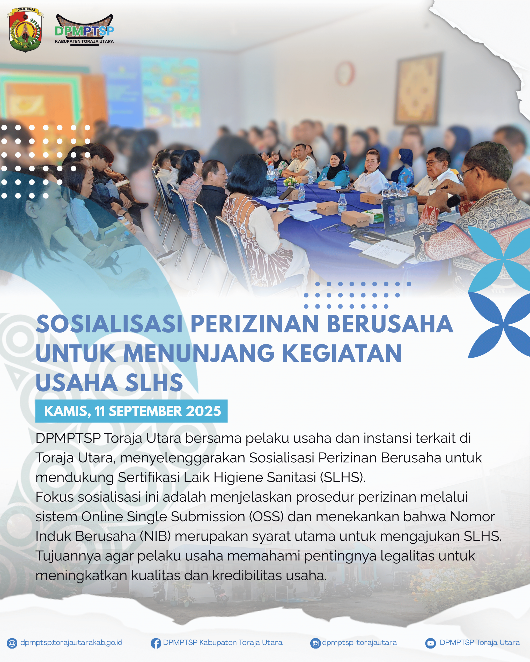 DPMPTSP Toraja Utara menyelenggarakan Sosialisasi Perizinan Berusaha untuk Menunjang Kegiatan Usaha Sertifikasi Laik Hygiene Sanitasi (SLHS). Dihadiri oleh Pelaku Usaha, Forum Kabupaten Sehat Toraja Utara, Dinas Terkait, dan Kecamatan. Sosialisasi ini berfokus pada penyampaian informasi mengenai alur dan prosedur perizinan berusaha yang terintegrasi melalui sistem Online Single Submission (OSS). Materi utama mencakup pentingnya Nomor Induk Berusaha (NIB) sebagai identitas...