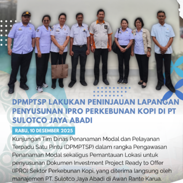 Rabu, 10 Desember 2025 – Dinas Penanaman Modal dan Pelayanan Terpadu Satu Pintu (DPMPTSP) melaksanakan kegiatan pemantauan lokasi dan koordinasi di PT Sulotco Jaya Abadi, Awan Rante Karua. Kegiatan ini bertujuan untuk memverifikasi data lapangan sebagai bahan penyusunan dokumen Investment Project Ready to Offer (IPRO) pada sektor usaha perkebunan kopi. Dalam kunjungan ini, tim DPMPTSP meninjau langsung area perkebunan dan...