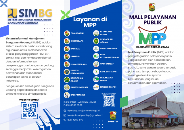Untuk memudahkan akses informasi bagi masyarakat, DPMPTSP Kabupaten Toraja Utara menyediakan panduan layanan dalam format digital (e-leaflet). Materi ini memuat informasi esensial mengenai layanan yang terintegrasi di Mall Pelayanan Publik (MPP) Kabupaten Toraja Utara, meliputi: Daftar 17 instansi yang tergabung. Jam operasional pelayanan. Panduan akses layanan digital nasional dan daerah: OSS RBA, SIMBG, MPP Digital, dan SiJempol Peri. Silakan unduh e-leaflet panduan layanan MPP...